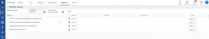 Para generar informes sobre el uso de tus vehículos, navega en el menú lateral: Conductores, vehículos e informes, luego en el menú superior selecciona Reportes → Biblioteca.