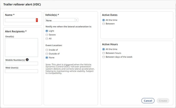 Pour créer une alerte de retournement, rendez-vous simplement dans « Paramètres, Alertes & POI », puis « Alertes », « Création », et cliquez sur « Alerte de retournement de remorque (VDC) ».