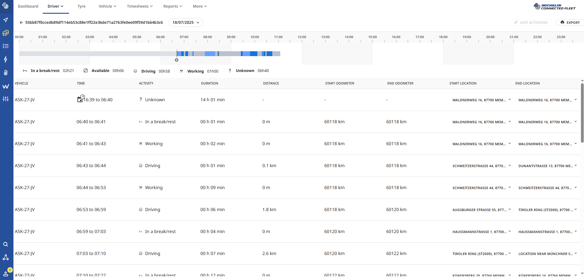 The end-user can choose a specific day and view the detail of the drivers' activities from the timesheet.
