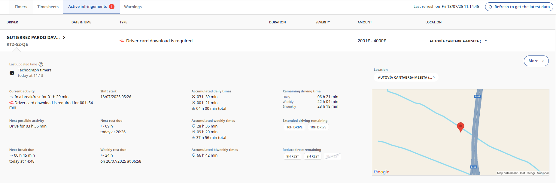 - map: tachograph activities and infringements are displayed in an interactive journey and timesheet