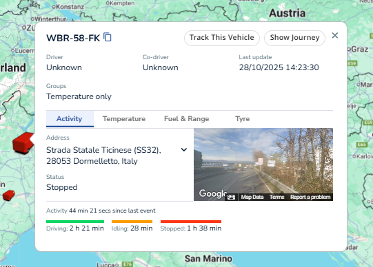 Depending on the vehicle and the available data, you can monitor various elements such as its activity, temperature, door status (cold chain), battery level or fuel range, as well as tyre pressure and temperature, and more.