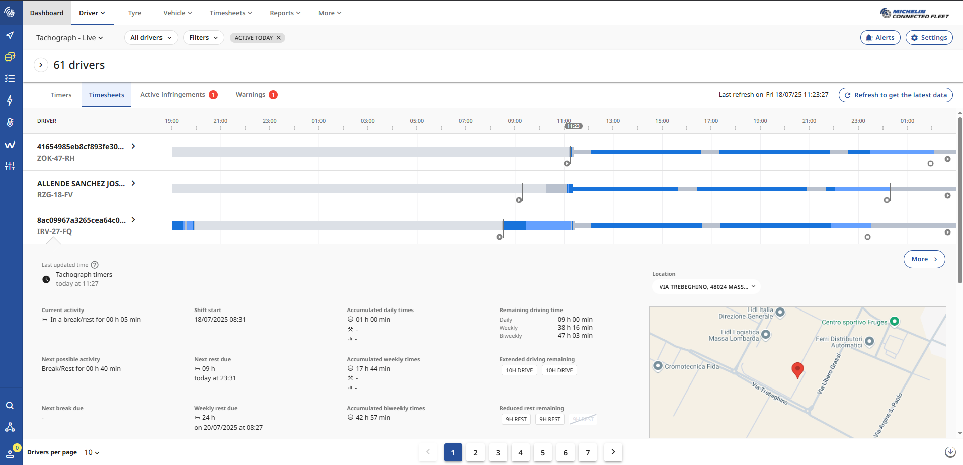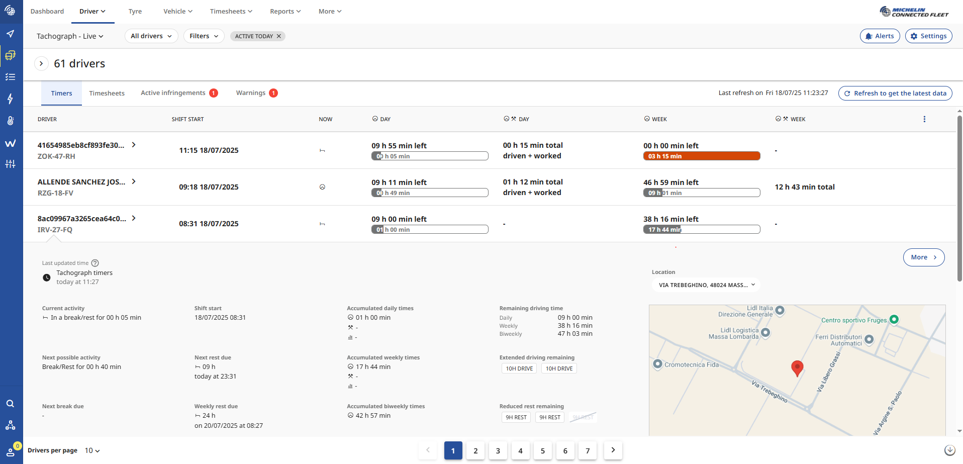 - Pressing the “Refresh” button updates all drivers with the latest data captured from the tachographs