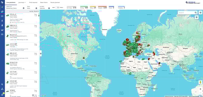 The vehicle list panel is accessible from the map view. Within this view is a list of vehicles and their current location. Where a vehicle is at a saved location it will display the Name and Icon of the saved location.