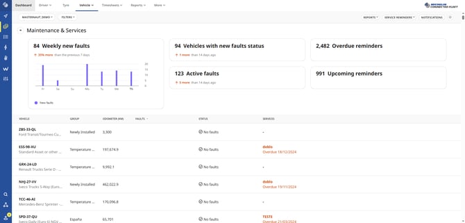 The main panel now shows the vehicles with the list of faults identified using icons rather than text to make it more visible to fleet administrators.